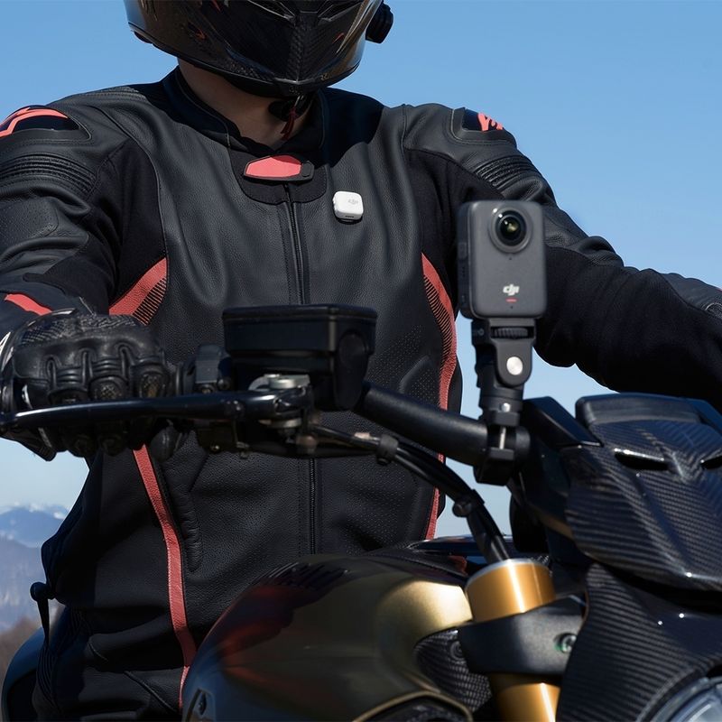 Ao montar em um veículo para fotos com perspectiva de terceira pessoa, use-o sempre com a braçadeira dupla robusta Osmo e o bastão de selfie invisível de fibra de carbono de alta resistência.