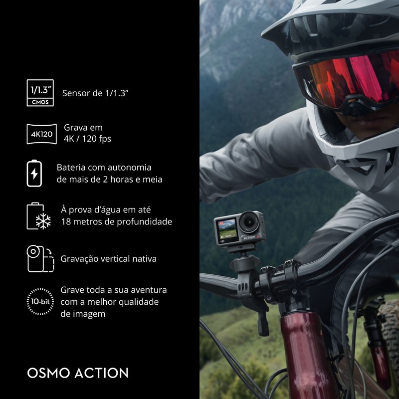 Com fotos dinâmicas, áudio cristalino e recursos perfeitos de pós-edição, a DJI Osmo Action 4 foi desenvolvida para gravar o que há de mais moderno em esportes de ritmo acelerado.