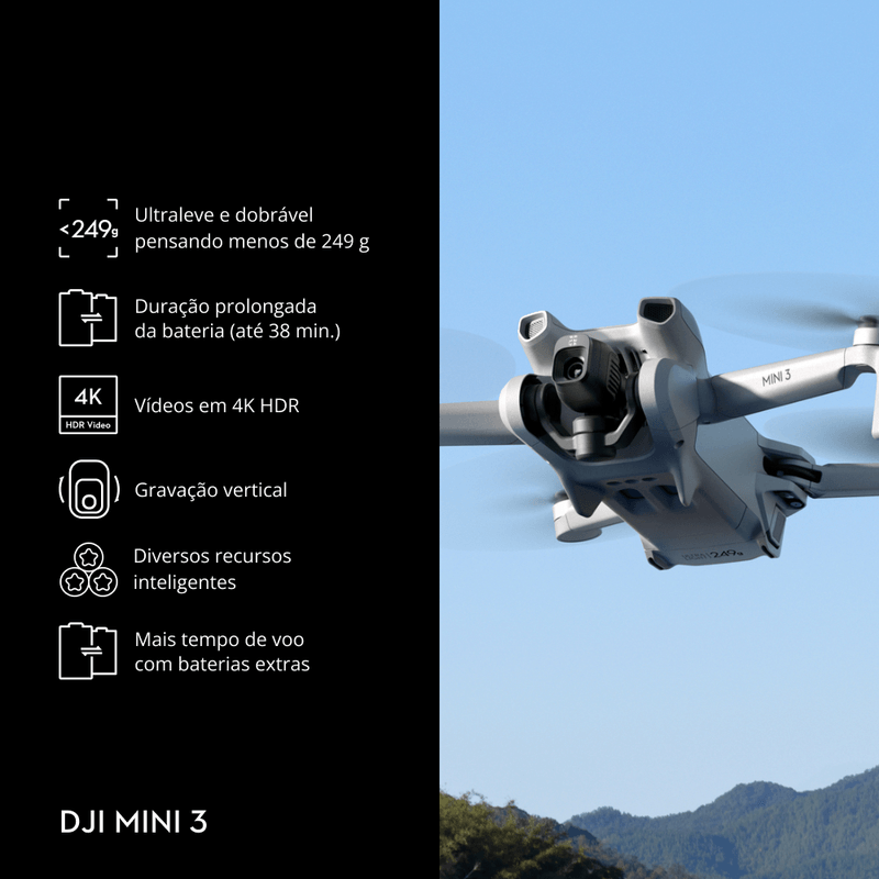 O DJI Mini 3 é um drone com câmera supercompacto, leve e pronto para aventuras. Conta com duração prolongada da bateria, gravando vídeos incríveis em 4K HDR capazes de capturar cores e detalhes vibrantes, além de recursos como gravação vertical, criando cenas incríveis para as redes sociais. Seja ao passear pela praia, em uma viagem de fim de semana ou de um mês, esteja sempre pronto para capturar cada detalhe.