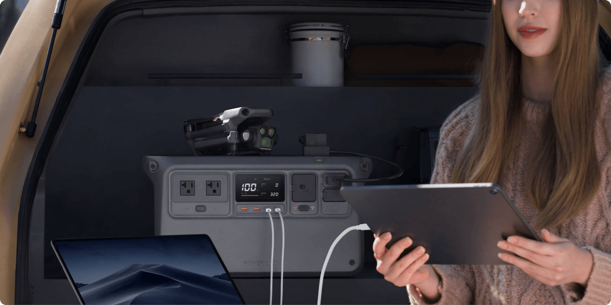 A DJI Power 500 pode ser recarregada de quatro maneiras: carregamento na rede elétrica, carregamento USB-C, carregamento solar e carregamento em veículos. Seja em ambientes internos ou na estrada, você pode escolher de forma flexível o método de recarga que funciona para você.